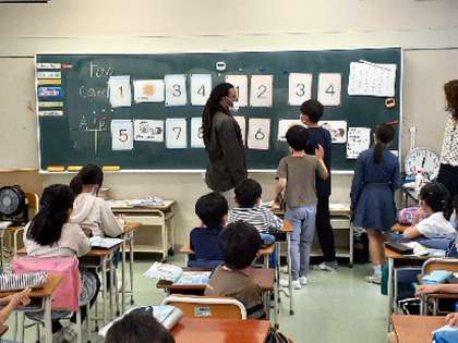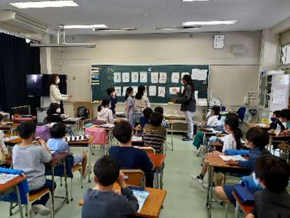 今日は天気と遊びをテーマに活動しました。黒板に貼られたカードをチームで相談して2枚選び、同じ天気、同じ遊びのカードをめくることができたら1ポイントもらえます。カードをめくるたびに、ALTから英語で「今日の天気は?」「~で遊ぼう!」など質問の答えやリピートを求められ、みんなで元気よく声を出していました。楽しく活動することができました。