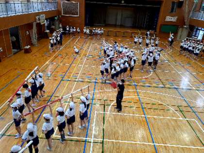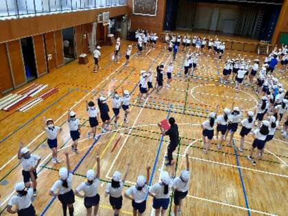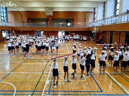 あいにくの雨ですが、6年生は運動会までの歩みを止めず、体育館でできることを取り組みました。棒を使った演技に新たな動きを加えることになったようです。まずはクラスごとに動きの確認をし、その後、音楽に合わせて全体で練習をしました。昨日の練習を見ていた4年生が「すごい!あんなことができるなんて!」と驚いていたことを6年生に紹介すると、照れくさそうにしていましたが、その事を知ってやる気がますます湧いたようです。雨でも完成度を高めるよい練習となりました。