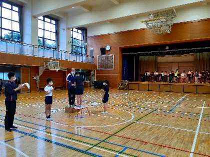 天気が不安定なため、今日の運動会全校練習は、明正チャンネルを通して行いました。開閉会式の流れや約束事を確認しました。今年の運動会のスローガンは「心を一つに 元気で楽しい運動会」です。そのスローガンを達成するためにも、開閉会式の参加の仕方についての規律を守ることも大切です。気を付けの仕方、休めの姿勢、礼の仕方なども全校でそろえられるように練習をしました。
