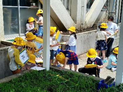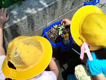 1年生が、芽を出したアサガオの観察を行っていました。まだまだ小さいアサガオですが、観察カードに大きく描くよう頑張っていました。子葉の模様まで観察し絵にしていました。乾いてきた土の様子に気付き水やりをする姿もありました。観察を通して、アサガオの成長を楽しみにする気持ちやお世話をする喜びの気持ちも育っています。