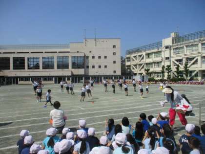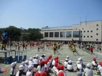 天候に恵まれ、表現運動を見合うことができました。1年生「Let’s ダンス ぐんじょう」は、速いテンポの曲でも、一生懸命、楽しそうに踊っていました。ひまわり「HMCA〜ひまわりは何でもできる!〜」は、踊りのかわいさと、組体操技の力強さを感じました。フラフープを使った演技も見応えがありました。3年生「Rising Sun〜明正小を照らせるように〜」は真似してみようと思ってもなかなか難しい動きですが、笑顔で踊る姿が印象的でした。