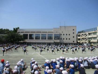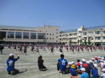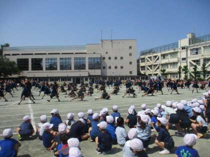 5年生「Let’s!! ソーラン節」は、「心を一つに」という目標に向かってがんばろうという気持ちの感じられる力強い動きでした。一人一人の真剣な表情に感動しました。4年生「明正の風」は、エイサーの難しい動きにも練習を重ね、なかなか揃わなかった音もしっかり揃っていました。高学年らしさを感じました。2年生「みんなでシェー!元気にシェー!」は、隊形移動もしっかりできていました。大きく自信をもって踊るように気を付けてきたそうです。