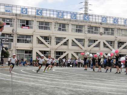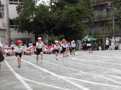 スタートラインに立つと、どの子どもも緊張した表情で合図を待ちます。4年生は高学年の仲間入りをして初めての運動会です。80メートル走は昨年に引き続きですが、走り方に力強さが加わっていました。カーブの曲がり方も上手で、直線に入ると一気に走り抜けて行きました。