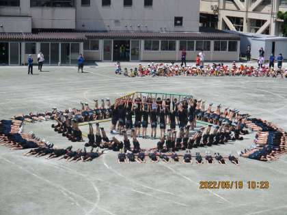 明正小学校の絆がこの先も深まり続けてほしいという強い思いから生み出された「絆跡」を合言葉に練習を重ねてきました。手の先から足の先、そして目線まで、全身に神経を集中させて、絆を表現するという大きなテーマに挑みました。