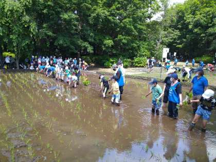 田植えが始まりました。はじめは、「気持ち悪い〜」という声が聞こえましたが、「止められない〜」「あたたかい〜」という声に変わりました。田んぼの土の中はあたたかいです。