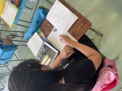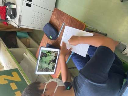 タブレットと観察カードを使って変化したところを見比べると、つるが長くなっていたり葉が大きくなっていたり、はたまた虫に沢山食べられていたりとちがいを見付けていました。