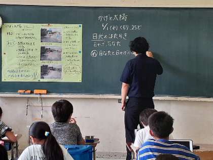 「かげと太陽」の学習をしています。前時までに、かげの動きと太陽の動きの関係性を学びました。子どもたちの意見から、本時の学習問題「日なたと日かげには、どのようなちがいがあるか、くらべよう」