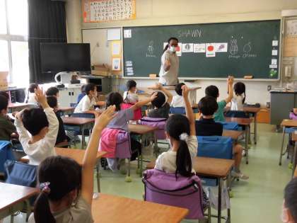 1年3組は2時間目にショーン講師と英語の学習を行いました。色、果物、食べ物、動物などについて「What 〜do you like?」の質問がされ、子どもたちが次々に答えました。そのあとはショーン講師の好きなものを当てるゲームをしました。どちらの質問にも元気よく手が挙がり、予想が当たると「やったあ。」と大きな声で喜んでいました。カレーライス、おにぎり、ハンバーガー、すしなど好きな食べ物の話になると「もう、お腹がすいちゃったよ。」と言う声が上がり、みんな思わず笑ってしまいました。