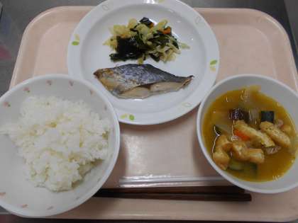 ごはん サワラの塩こうじ焼き かむかむ海藻サラダ 夏野菜の豚汁 牛乳
