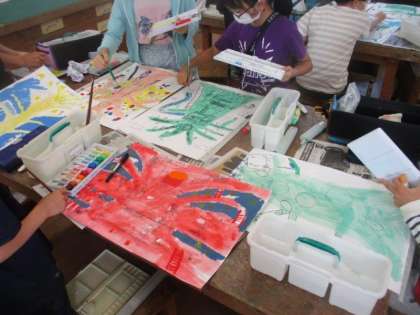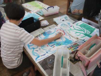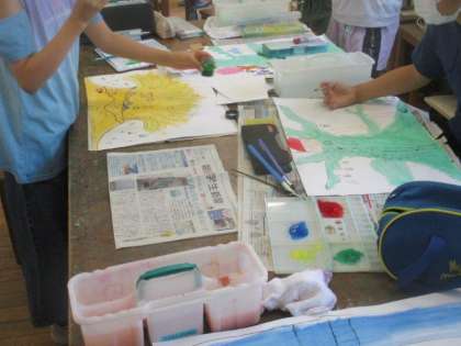 4年生が図工で、画用紙に絵の具で「大きな木」を描いています。木にあるものや、木に居るものを想像して描いたり、背景の色や塗り方を工夫したりしています。教室内を見回すと、同じような木は一本もありませんでした。