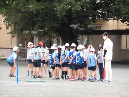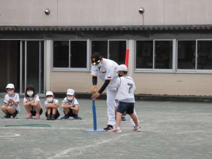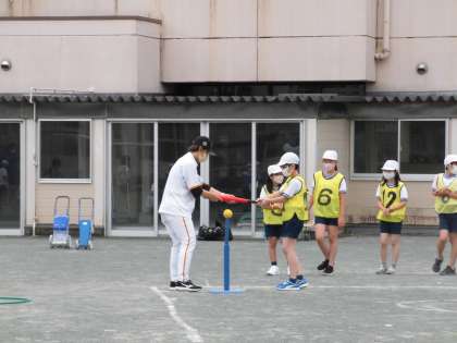 お話を聞いて、軽くランニングをしたあと、2チームに分かれてミニゲームが始まりました。バッターボックスに立つ児童に、ティーに乗ったボールをうまく打つこつをアドバイスしてくださり、順番を待つ児童もその言葉を真剣に聞いていました。