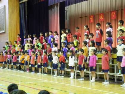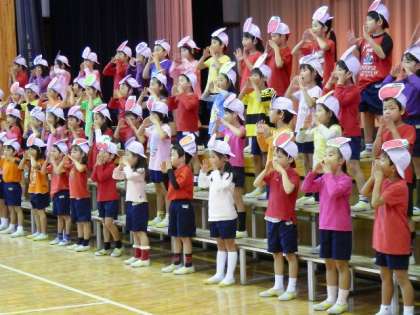 1年1,2組は、共通曲「しょうじょう寺のかたつむり」と「ぼくのミックスジュースと」という曲を歌いました。「しょうじょう寺のかたつむり」は二つの曲が交互に歌われ、両方の曲調がとてもよく表れ、見ていて感心してしまいました。「ぼくのミックスジュース」という曲には、1年生らしい振付があり、とても楽しい曲でした。