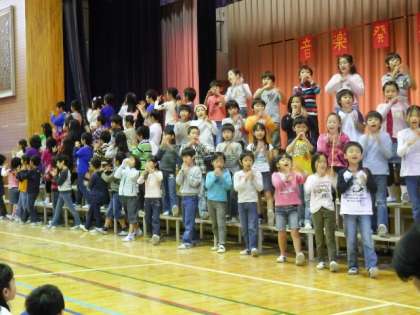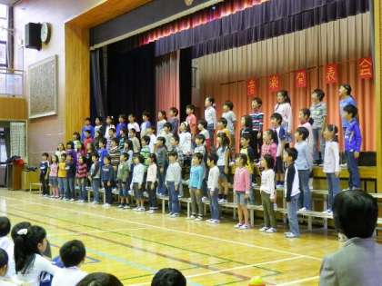 3年生は共通曲が「ふじ山」、2,3組は「ドレミの歌」を歌いました。出だしの所で「富士山が見えた」というセリフがありましたが、今日は本当にきれいな富士山が朝から見えており、歌からその姿が目に浮かびました。「ドレミの歌」は元気な3年生らしく誰もがはずむような気持ちになりました。