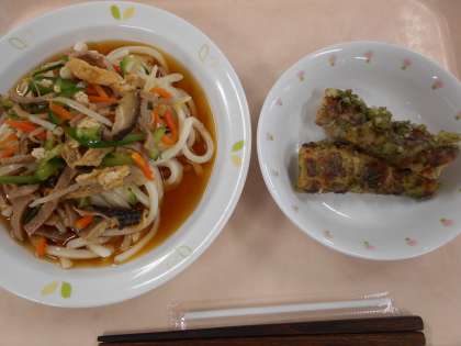 五目冷しうどん ちくわの磯辺揚げ 牛乳