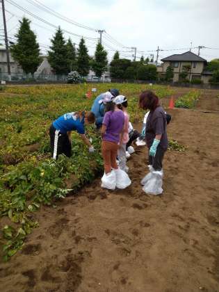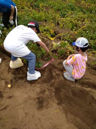後半チームもじゃがいもほりが始まりました。茎を持って、お相撲さんのように上に引っ張ります。根にじゃがいもがついています。抜けなかったじゃがいもも、周りの土をほって見つけました。たくさん収穫できています。