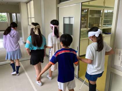 共生社会をテーマにした総合的な学習の時間の一環で、視覚障害者を疑似体験する「ブラインドウォーク」に挑戦しました。