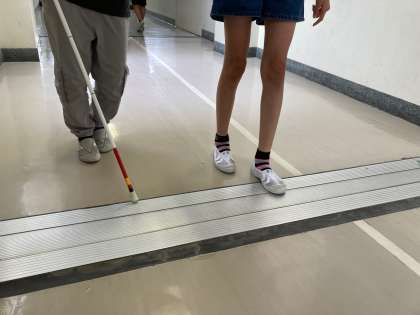その後二人一組になり、目隠しをして白杖を使って歩いたり、補助したりして校舎内を歩き、目が見えない方の気持ちを共有しました。