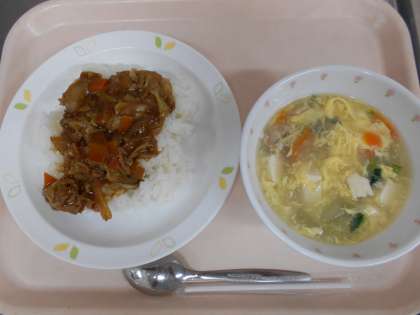 ホイコーロー丼 冬瓜と卵のスープ 牛乳