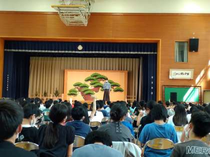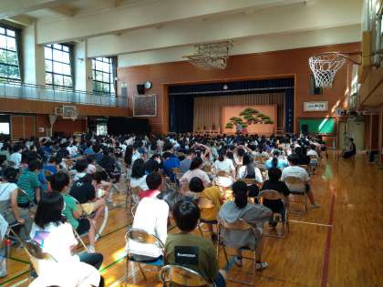 6年生が古典芸能鑑賞教室に参加しました。喜多見小の6年生も明正小に来て、体育館で行われました。世田谷パブリックシアターの方が狂言「附子」を演じてくれました。難しい言葉がありましたが、演者の動きや前後の言葉から想像し、理解できました。ワークショップでは、「柿山伏」にある柿をもいで、食べる様子を体験しました。