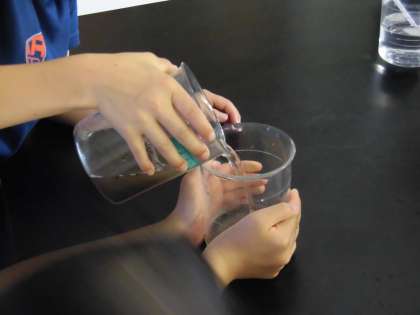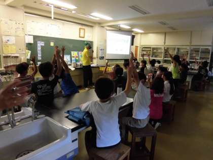 「SHOTAくん」というお兄さんと説明をしてくれるお姉さんの2人で楽しく授業が始まりました。下水道が整備されていなかった昔の川と現在のきれいな川との比較から始まり、水再生センターの役割やそこで行われる水の浄化作業へと話が進みました。より分かりやすくするために、泥水から上澄みの水を分ける沈殿実験なども行いました。SHOTAくんやお姉さんから出されるクイズにも元気に答えていました。トイレにはトイレットペーパー以外流さない、油をふき取ってからお皿を洗うなど、自分ですぐにできることも考えました。