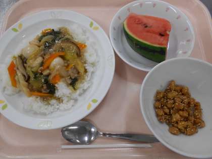 中華丼 大豆とじゃこの甘辛あげ すいか 牛乳