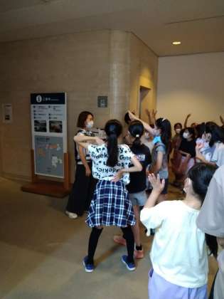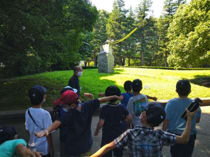 美術館の方からお話を聞いて、鑑賞が始まりました。屋外にも作品があります。作品の形を真似てみるのも鑑賞のを仕方の一つだそうです。