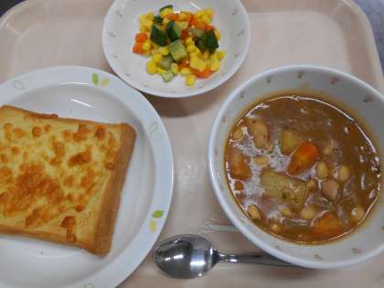 ガーリックチーズトースト ビーンズシチュー トロピカルサラダ 牛乳