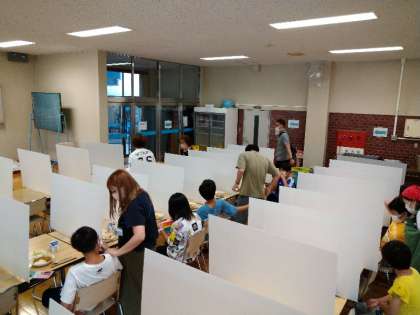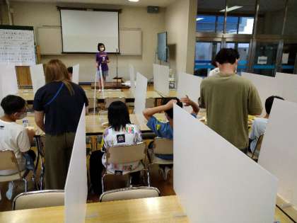 夕食の時間です。メニューはカレーライス、サラダ、メロン、牛乳です。黙食の決まりを守って食べることができています。