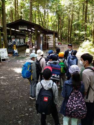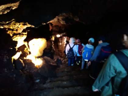 ハイキングが始まりました。富岳風穴に入りました。中の気温は3℃です。まるで冷蔵庫の中のようでした。最高気温の予想は26℃です。気持ちのいい風がふいています。