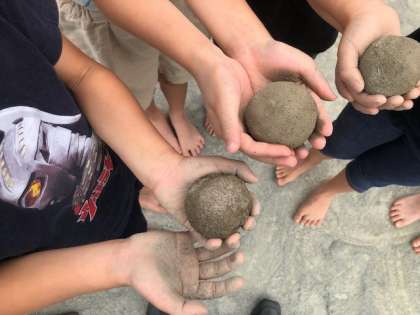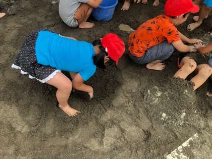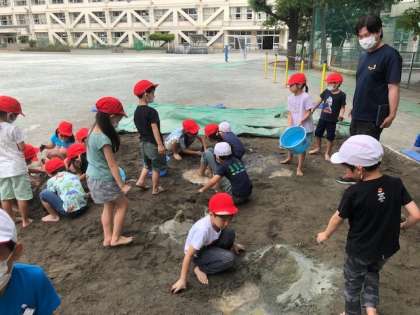 1年2組は図工で、砂場を使い造形遊びをしていました。水で砂をドロドロにして丸め、さらさらの砂を掛けて泥団子を作ったり、湿り気のある砂で山を作ったりと思い思いに活動し、造形遊びを楽しみました。裸足で、素手で、ドロドロの砂とさらさらの砂の感触を存分に味わいました。