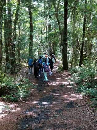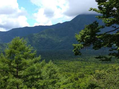 森林の中を歩いています。キノコやカタツムリを見つけました。青木ヶ原樹海がきれいに見えます。
