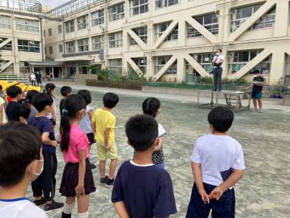 朝、校庭で月に1度の全校朝会がありました。