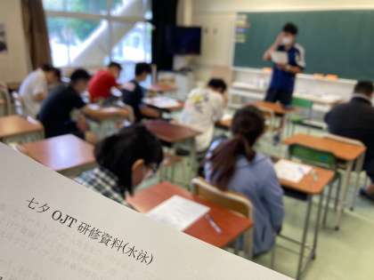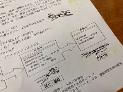 「苦手な子の前を歩いて水流を作ると泳ぎやすくなる」「水中から頭が上がってきたら頭頂に触れてあげ、それを合図に息継ぎさせるとよい」など、具体的で実践的な指導法を学びました。