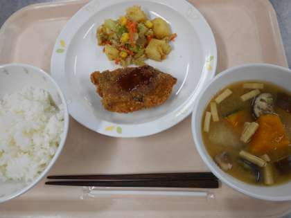 ごはん 白身魚のフライ ポテト入りごまドレサラダ 夏野菜のみそ汁 牛乳