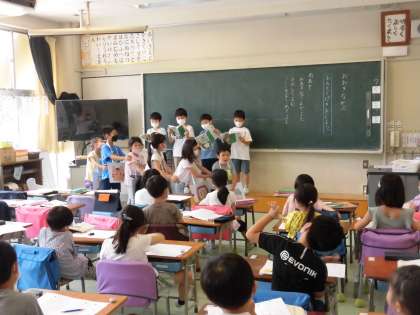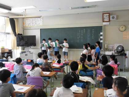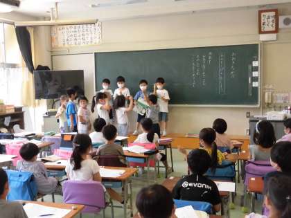 班で集まって練習をしてからいよいよ発表です。「最初にやりたい人は?」の声に「はい、はい。」と元気よく手が挙がりました。1番に決まった班のメンバーは少し緊張していましたが、劇が始まると自分の役を一生懸命に演じました。「うんとこしょ、どっこいしょ。」のせりふの時には、見ている人からもかけ声がかかりました。「ようやくかぶがぬけました。」でお話が終わり、拍手をもらうと、発表した班のみんなは嬉しそうに笑顔になりました。毎日お家で練習している音読の成果が表れた発表となりました。