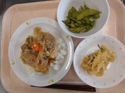 豚丼 だいこんとにらのごま風味 枝豆 牛乳