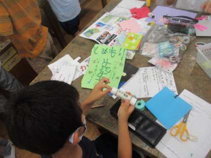 4年生が図工で、飛び出すカードを作っています。切り込みを入れたり貼り付けたりして、開くと立体的になる工夫をしています。絵を描いたり、キラキラなテープを貼ったり、色紙で模様を付けたりと、すてきなカードができあがっていました。カードを送る相手は、自分で決めているそうです。友達、家族。先生…一人一人が思いを込めてつくっていました。