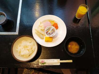 2日目の朝食です。メニューは、かまぼこ、玉子焼き、納豆、マカロニサラダ、味噌汁…です。