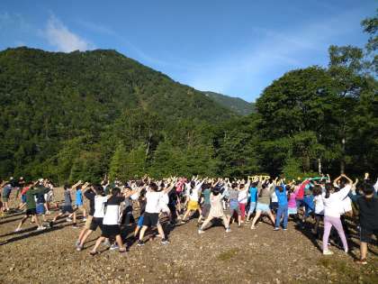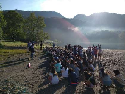 湯ノ湖畔に散歩をしてきました。運動会の棒体操の曲にあわせてみんなで体操しました。