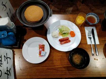 3日目の朝食が始まりました。メニューは、パンケーキ、スープ、ウインナー、サラダ…です。
