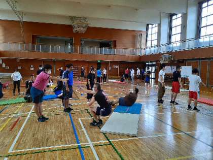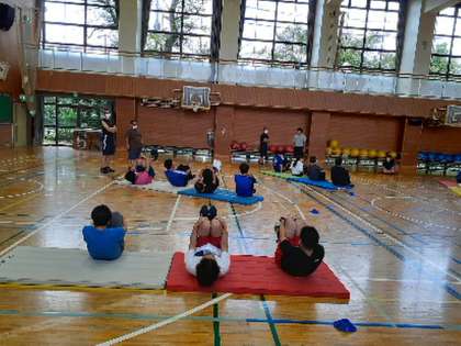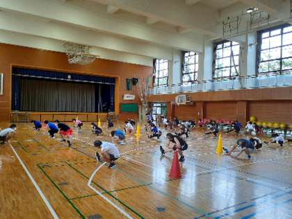 今日の午前中は、全教員が参加しての体育実技研修を行いました。器械運動領域を取り上げて体育部の教員が講師となって実施しました。跳び箱運動やマット運動は、けがにもつながりやすい運動です。これらを安全に行うために大切なことを全員で確認しました。また実際に体を動かしながら、器械運動につながる補助的な運動、感覚づくりの運動等、楽しく運動しながら技能の上達が図れる実技を研修しました。この研修を生かし、2学期に行うマット、跳び箱の運動を充実させていきたいと思います。