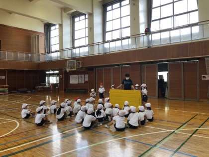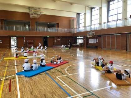 初めてのマットを使った運動遊びを行いました。最初に、安全なマットの運び方を確認しました。みんなやり方をすぐに覚え、安全に持ち運びができていました。マットを並べたら「ゆりかご」遊びをしました。身体を丸めゆりかごのようにマット上でゆれます。ゆれた反動を生かし立ち上がることにも挑戦しました。これからいろいろな遊び方を工夫していきます。