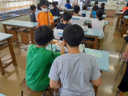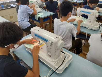 5年生は家庭科でミシンを使った学習をスタートさせました。ミシンの安全な使い方、動かす手順を教わり、実際に練習用の布を使ってミシンを動かしました。線の上をまっすぐに縫うためにどうするか、縫う方向を変える時にはどうすればやりやすいかなど、実践に必要な技能を考えながら使い方を身につけました。この技能を生かしてどのような作品を作り上げるのか楽しみにしています。
