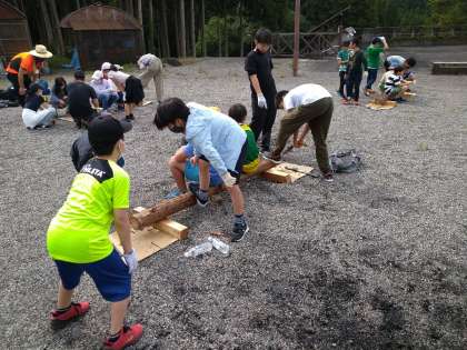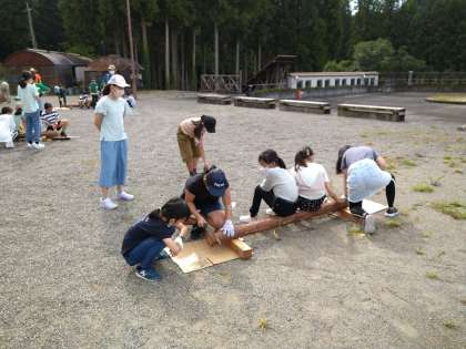 丸太切りが始まりました。なかなか切るのは難しく、疲れた〜手が痛い〜という声が聞こえてきます。切れた時の達成感は大きいようです。ヒノキのいい香りが広がっています。