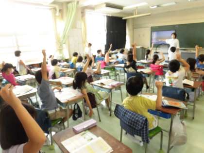 はじめに「辺」「ちょう点」がいくつあるのか数え、それぞれの特徴を復習しました。続いて、三角形と四角形を選ぶ問題を1問みんなで考えてみました。3つの辺があっても、途切れていたり、直線でない部分があるものは三角形とはいえません。なわとびで形を作って実際に確かめました。残りの問題は各自で挑戦しました。