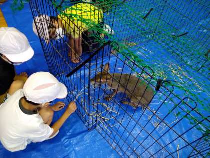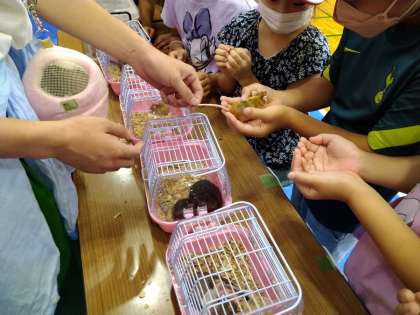 移動動物園に来てもらい、2年生が体験をしました。生活科で小動物と仲良くなる学習です。触ったりエサをあげたりしました。