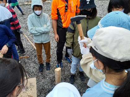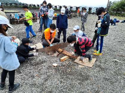 自分の分の丸太を切り終わった子は、林業で使う様々な道具を使う経験をさせていただきました。また、切り終わった丸太を使って丸太ケーキを作ったりして過ごしました。