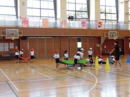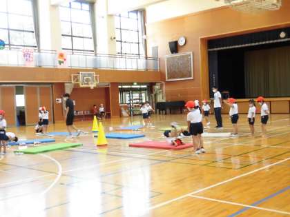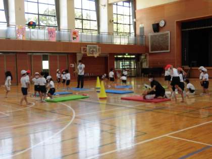 膝を抱えた姿勢で後ろに転がる「ゆりかご」で体を慣らしたあと、「前まわり」を練習しました。頭の後ろをマットにつけること、手を大きくパーに開くことに気をつけます。立ち上がった後に好きなポーズでジャンプをします。「おへそを見ながら回るとうまくいくよ。」とアドバイスをもらうと、まっすぐきれいに回る子が増えました。