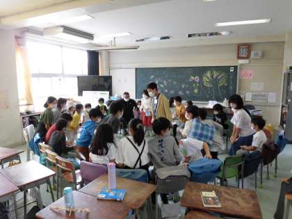 企画から準備、進行を6年生が担当します。5年生は1年生を迎えに行きます。給食のかたづけが終わると、6年生は早速準備に取りかかりました。使う道具を運んだり、会場づくりをしたり、黒板に絵を描いて会を盛り上げる班もありました。