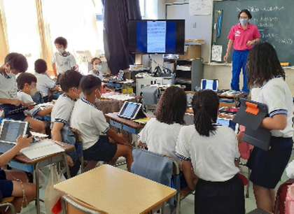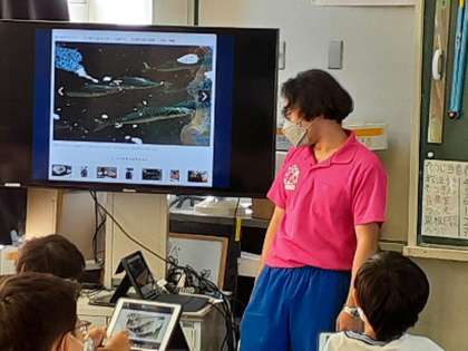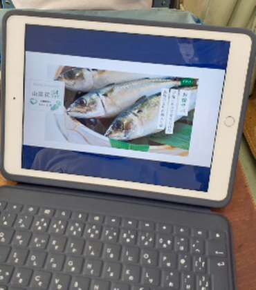 水産業ついて学んでいます。「お嬢サバ」というサバの動画から授業が始まりました。担任が実際に「お嬢サバ」を食べている動画なので、子どもたちの興味・関心は一気に高まりました。このサバは鳥取県岩美町の陸上養殖で育てた「箱入り娘」のブランドサバです。海のサバと陸上養殖で手塩にかけて育てた「お嬢サバ」の違いから、陸上養殖の工夫や苦労を学ぶことができました。